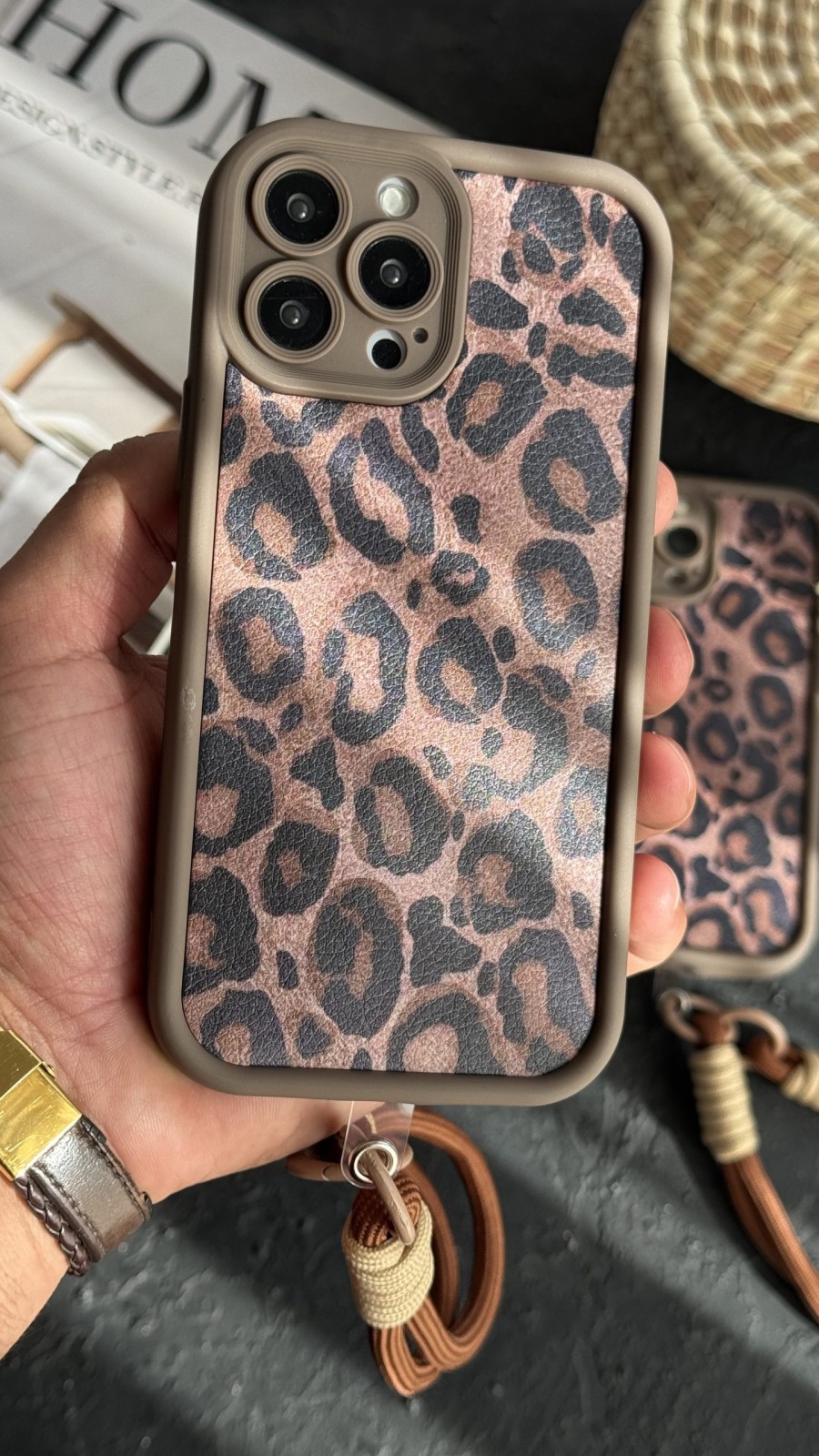 قاب موبایل ( آیفون ) پلنگی سولید قهوه ای + بند ست