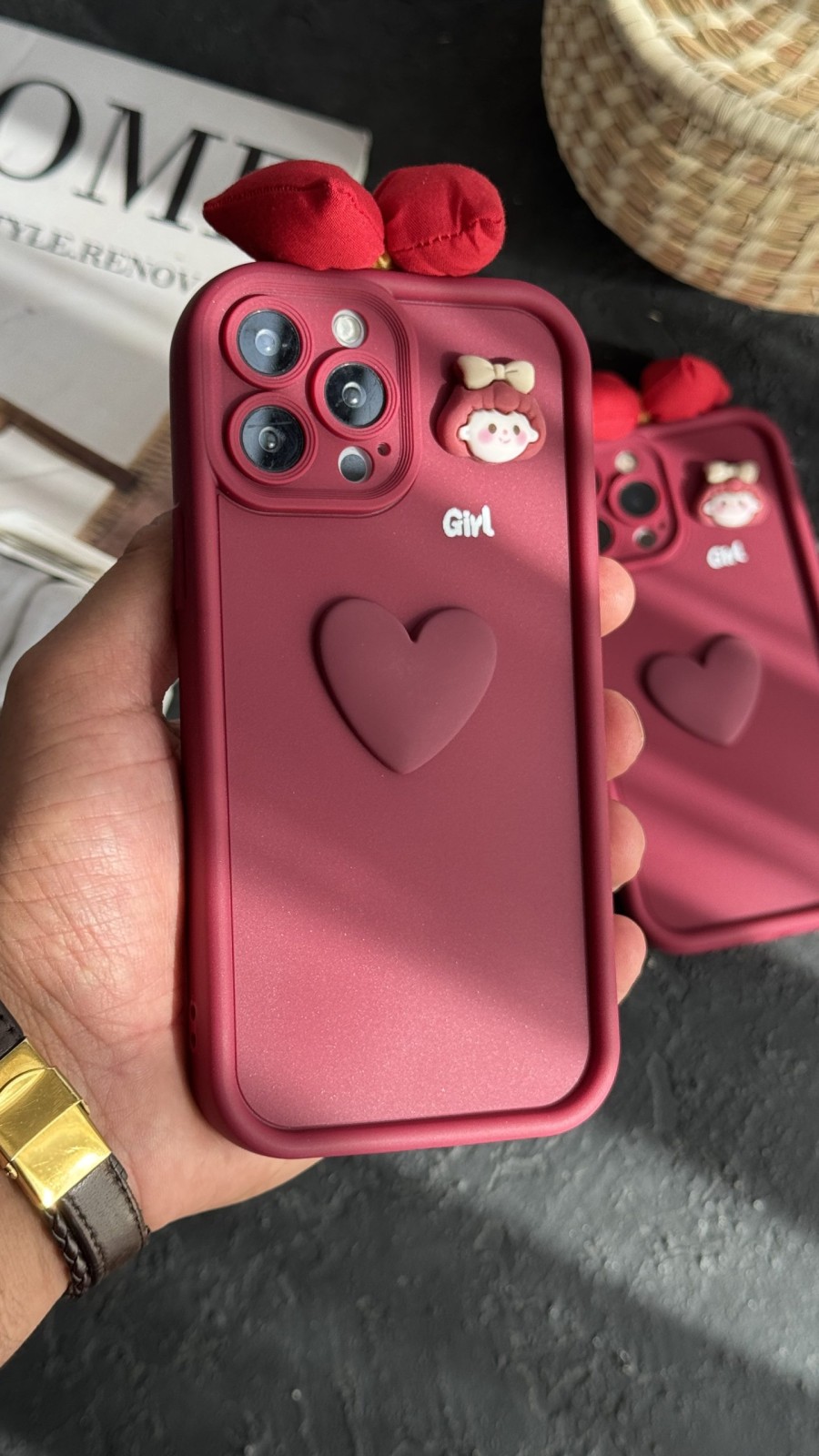 قاب موبایل ( آیفون ) دختر آلبالویی پاپیونی قلب برجسته