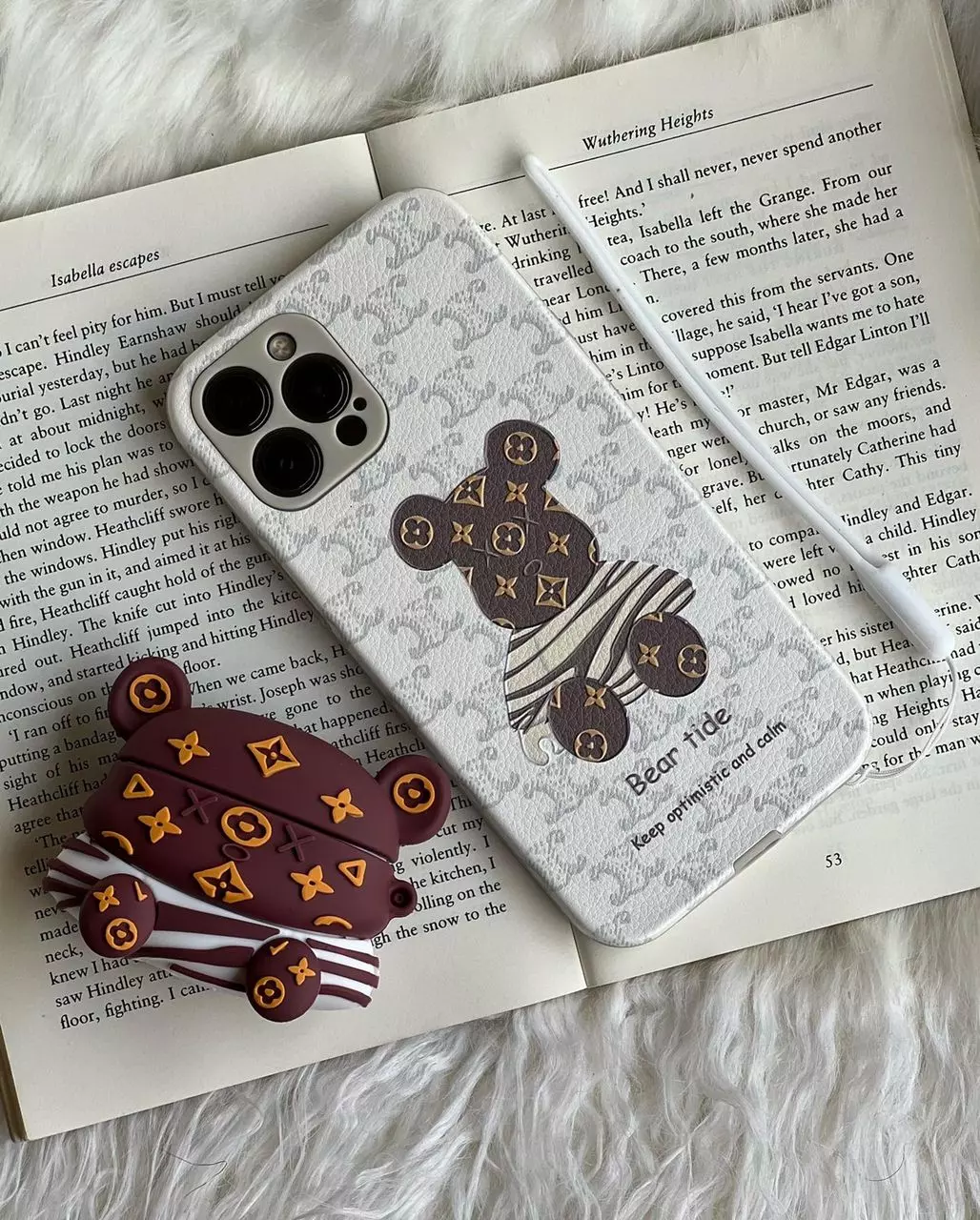 قاب موبایل آیفون خرس بهاری گوش دار پشت بیرنگ + بند آویز بلند