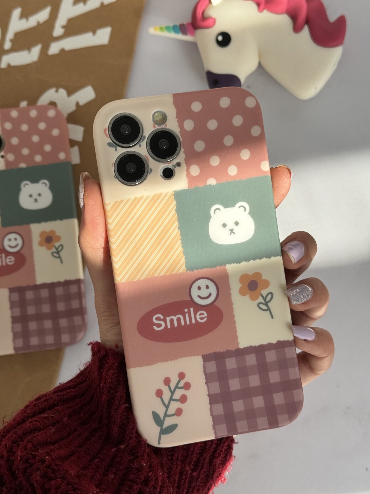 قاب موبایل آیفون خرس صورتی چهارخونه پرو کمرا محافظ لنزدار