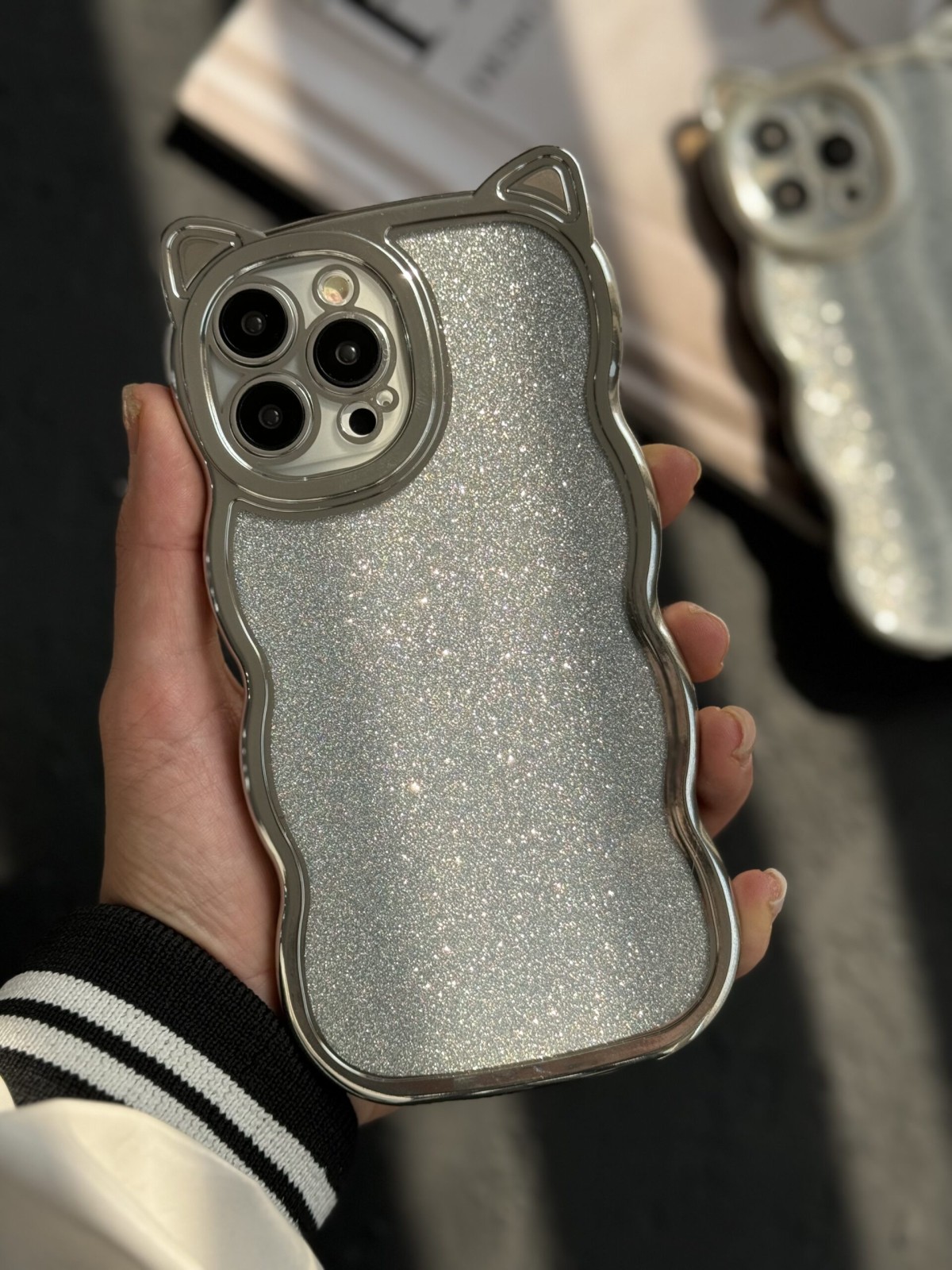 قاب موبایل آیفون گربه شاینی نقره ای گوش برجسته