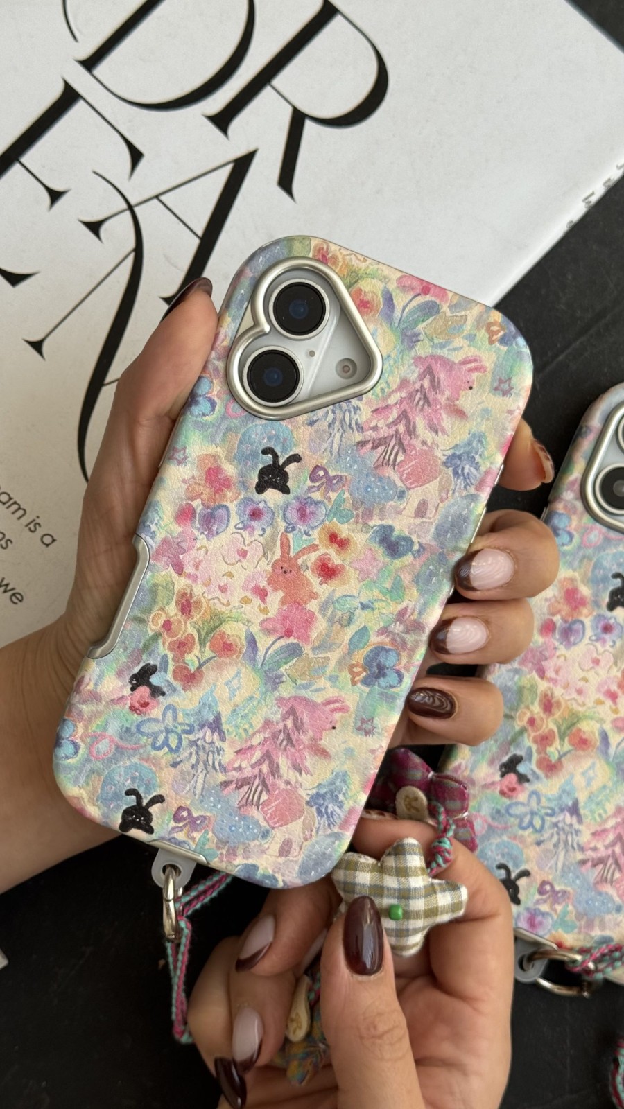 قاب موبایل آیفون خرگوش واندرلند + بندست گل پارچه ای