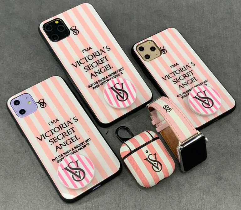 قاب موبایل ویکتوریا پشت گلس راه راه پاپ سوکت رایگان ( صورتی + سفید )