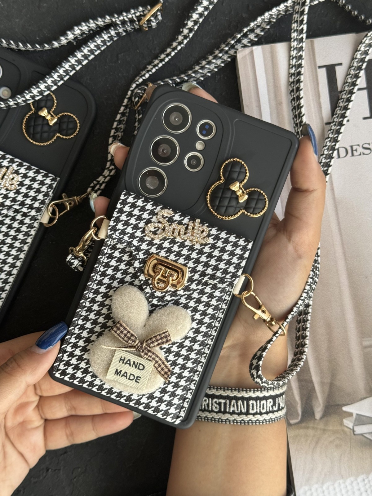 قاب موبایل ( آیفون – سامسونگ ) میکی اسکوییکی داگ آیینه ای نگین دار + بندست