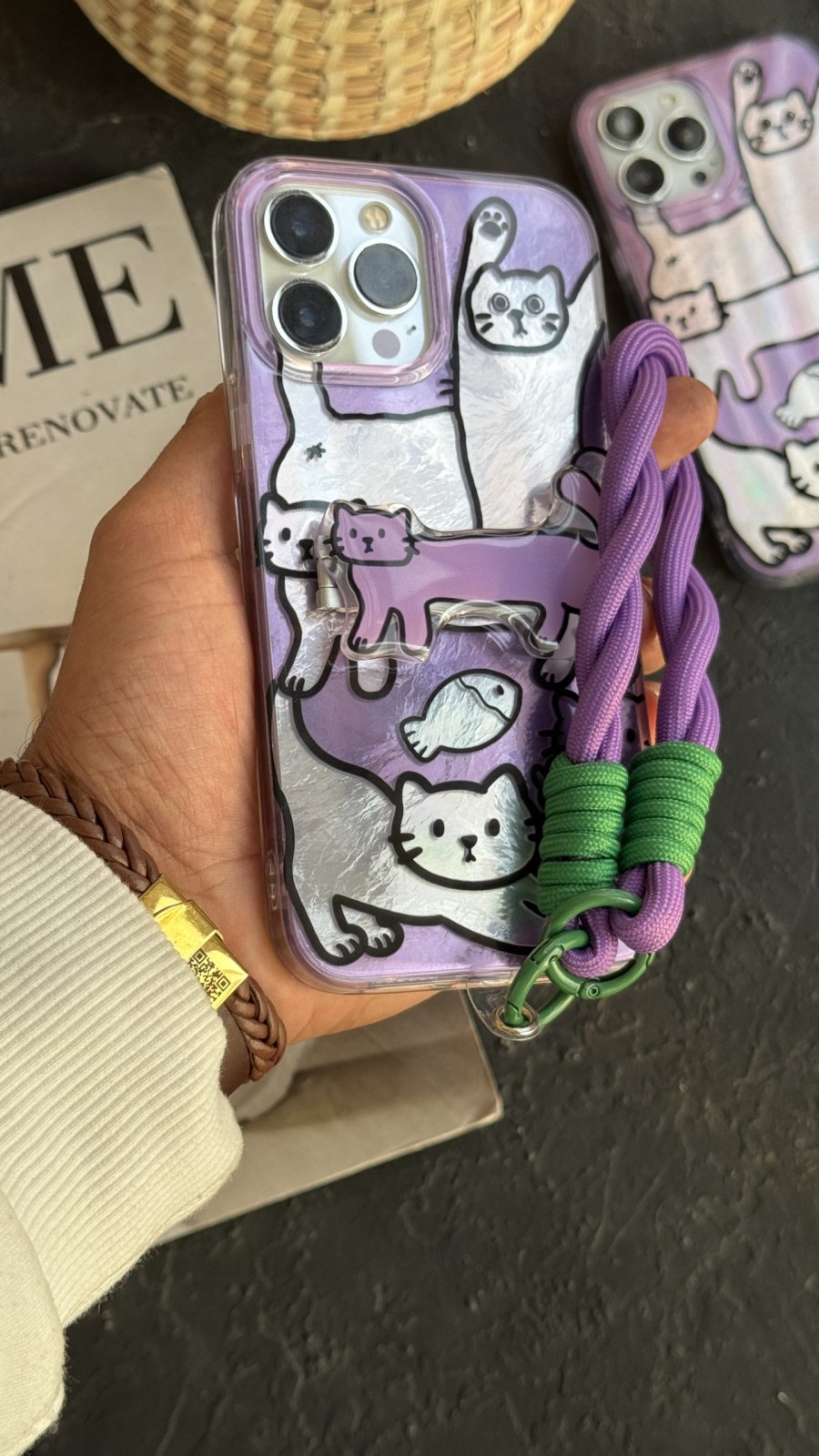 قاب موبایل آیفون گربه دراز سوسیسی بنفش پایه استندشو + بندست