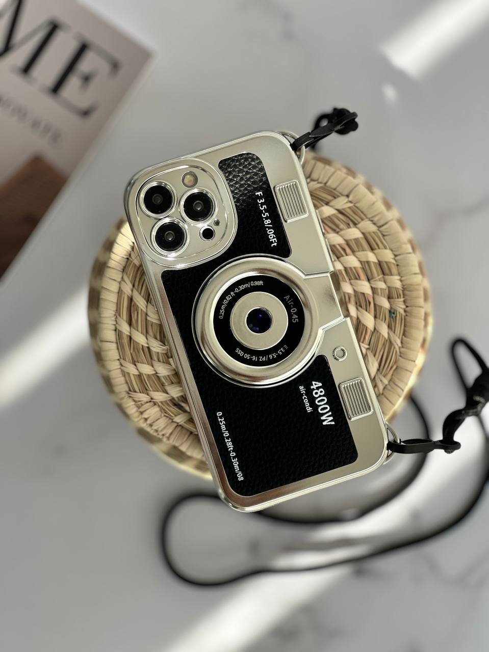 قاب موبایل آیفون دوربین آنالوگ کلاسیک محافظ لنزدار + بند بلند