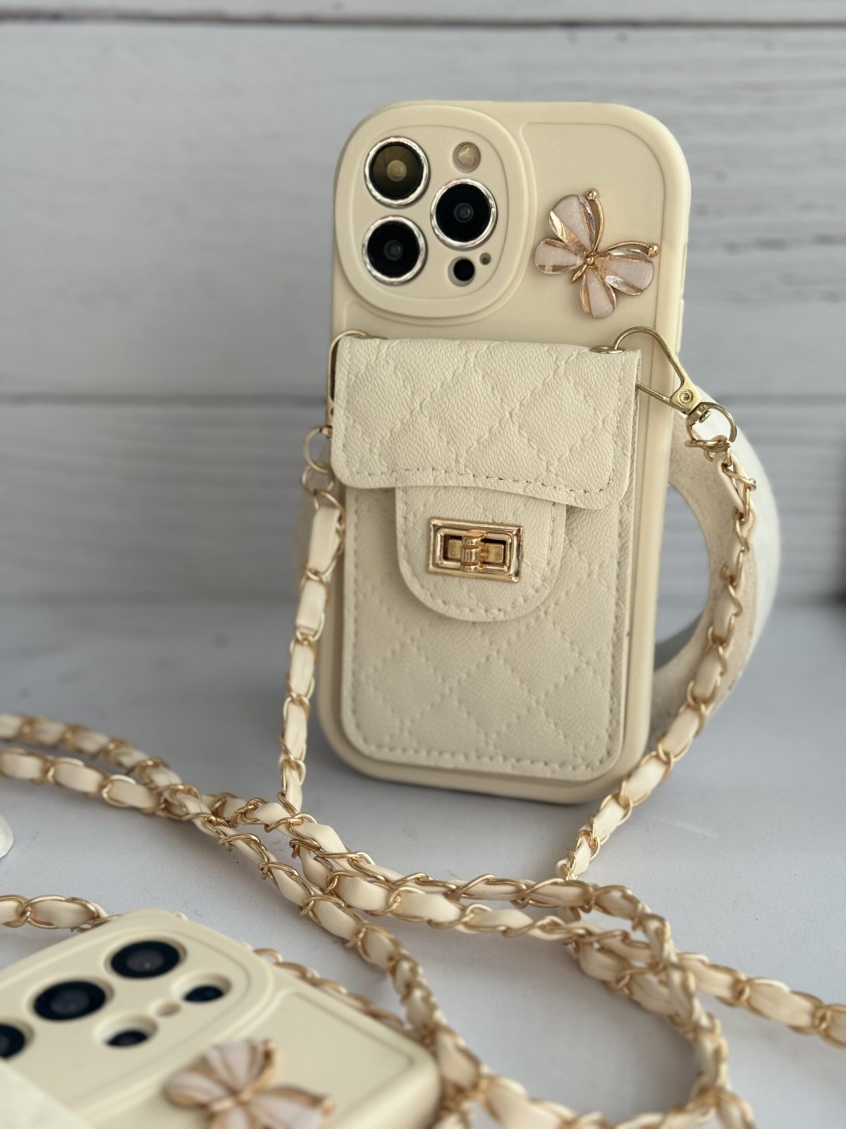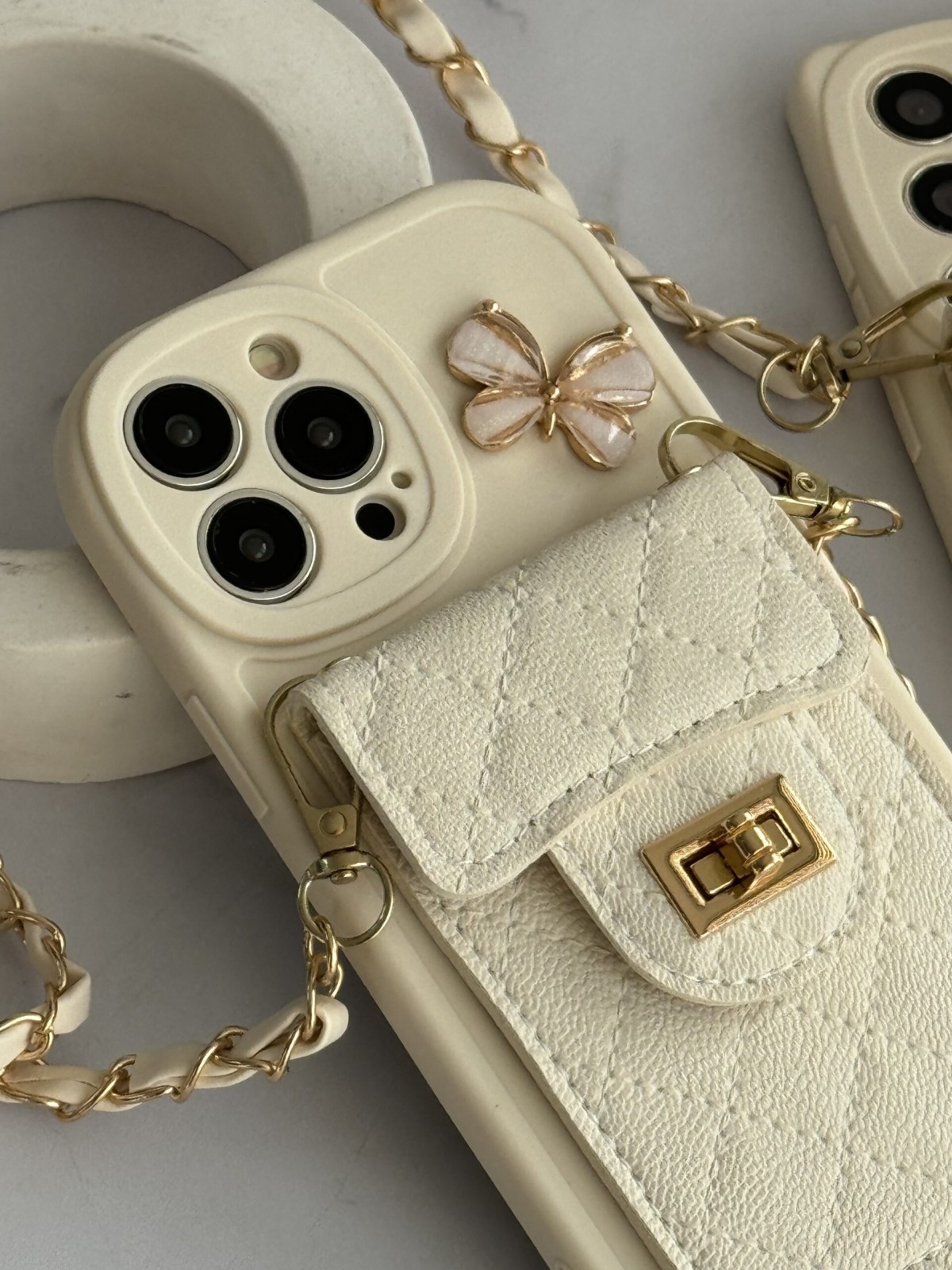 قاب موبایل بند زنجیری پروانهای جاکارتی دار دارای جاکارتی کاربردی در پشت خود است که به شما اجازه میدهد کارتهای بانکی یا کارت مترو را همیشه همراه داشته باشید. درب محفظه با قفل طلایی کوچک و شیک بسته میشود که ضمن زیبایی، امنیت کارتها را تضمین میکند.