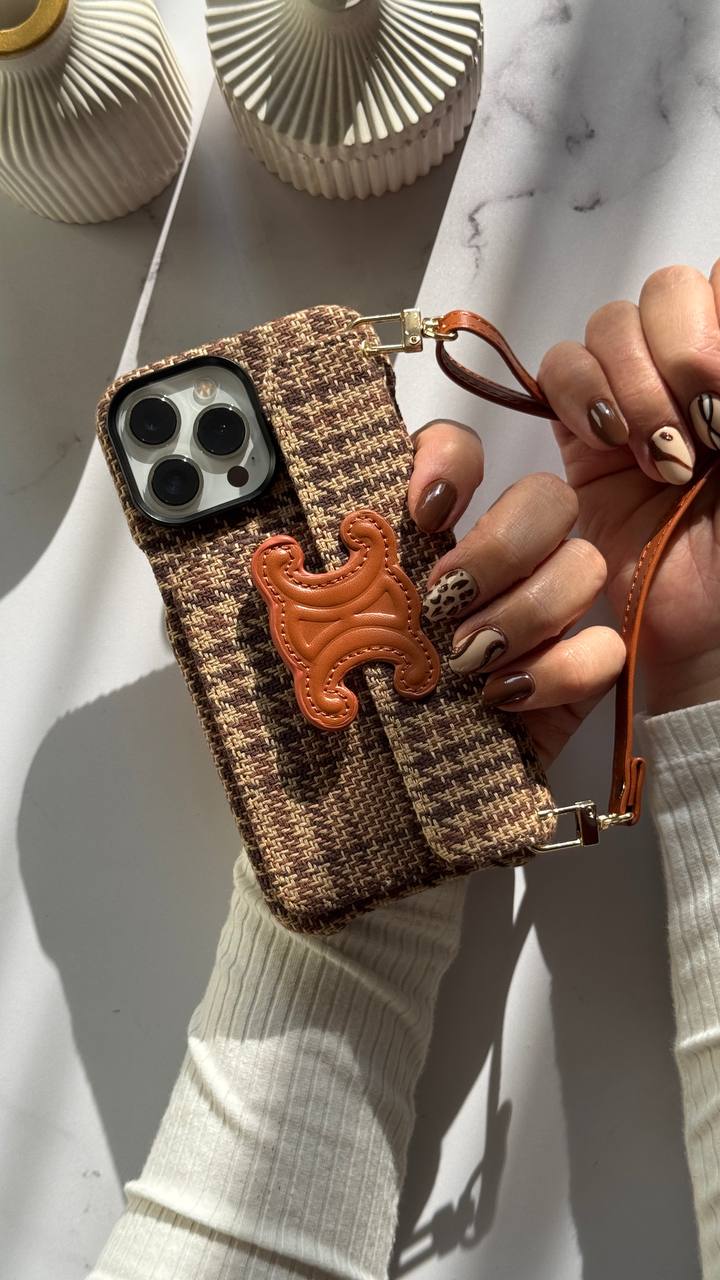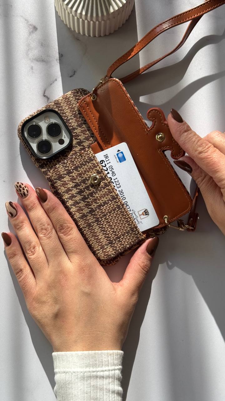 قاب موبایل ( آیفون ) سلین استریپ پارچه ای قهوه ای جاکارتی + بند بلند
