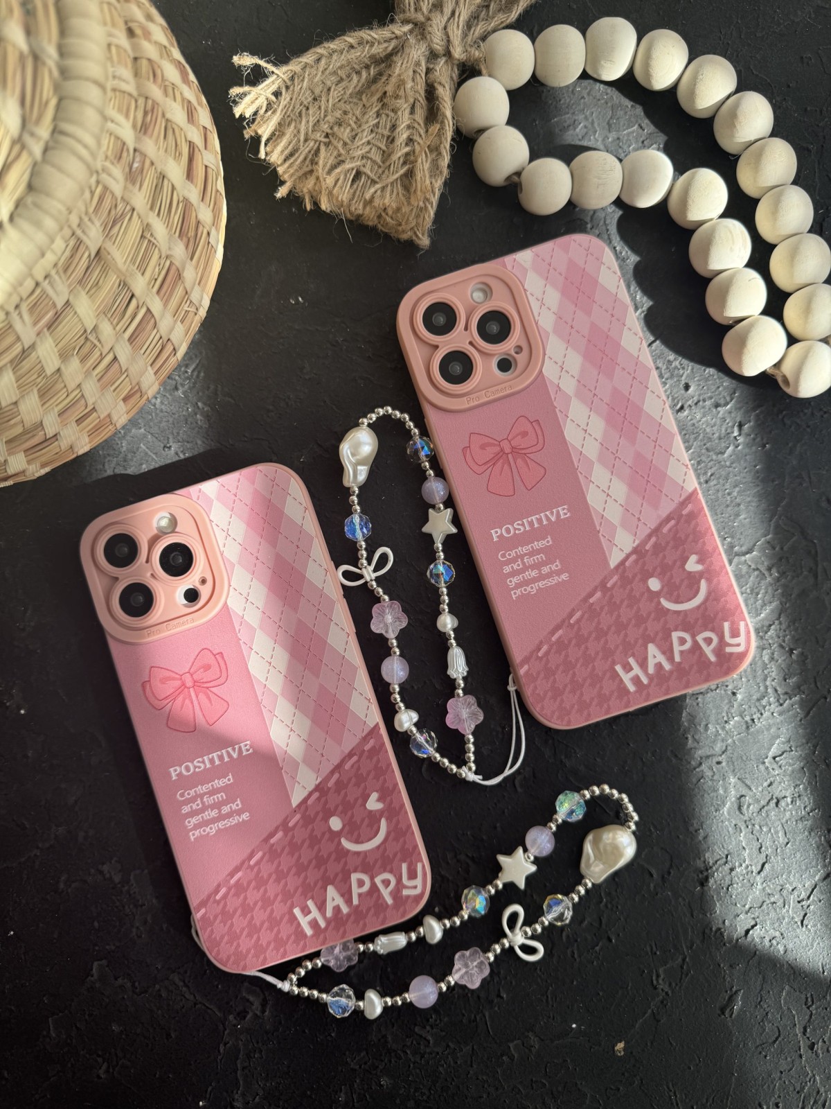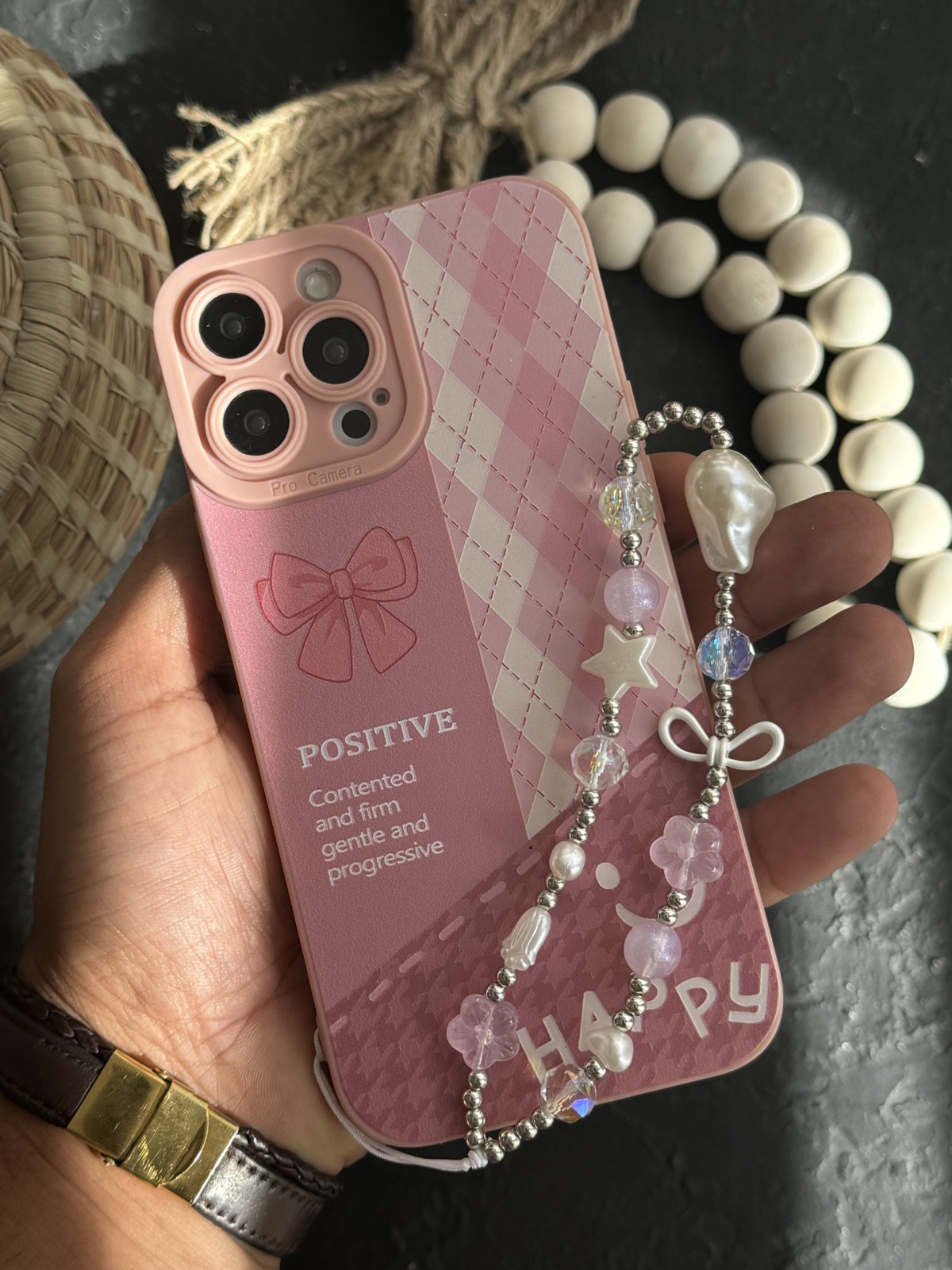 قاب موبایل آیفون پاپیون لبخند چهارخونه صورتی بندست ( بدون بند )