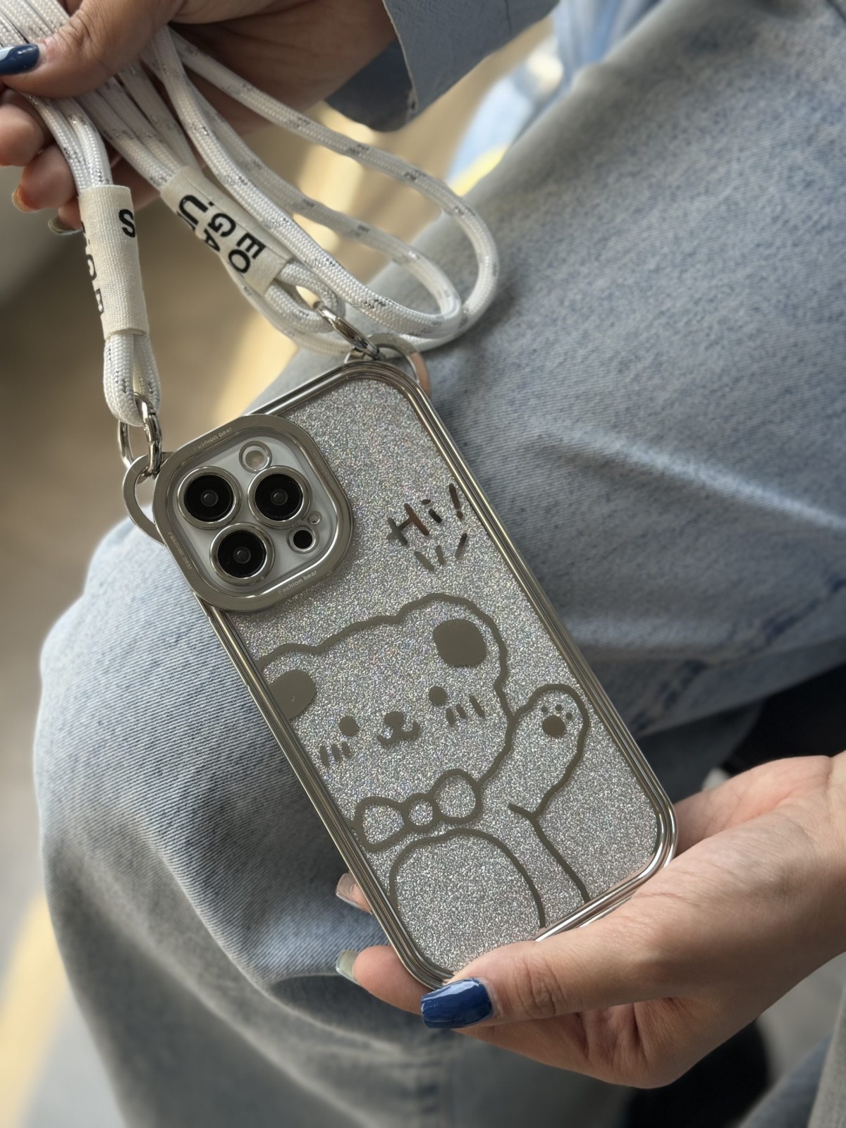 قاب موبایل سلام خرسی شاینی نقره ای + بند بلند آویز
