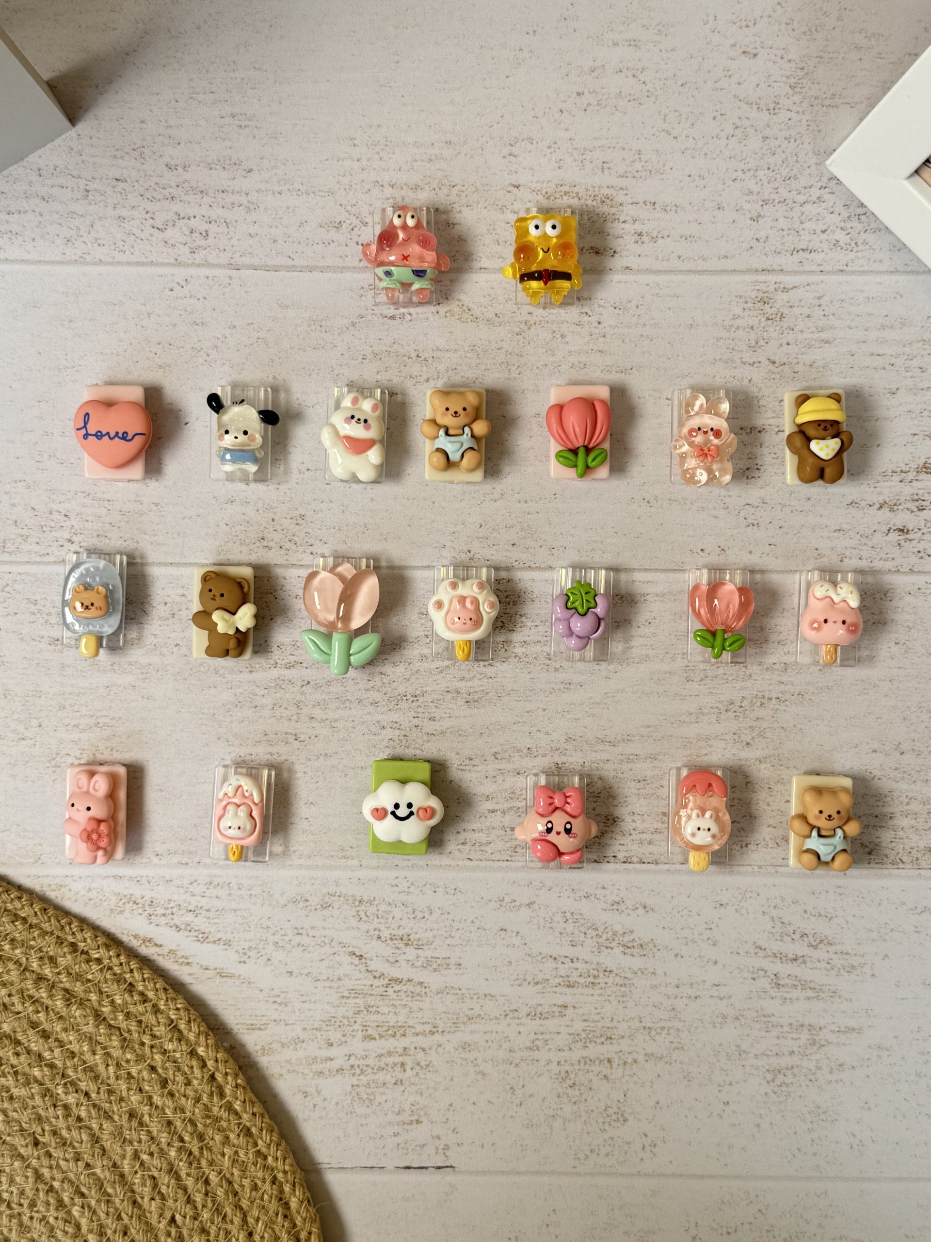 4-سگ شیشه ای ,3-قلب لاو ,21-بستنی شیشه ای خرگوشی ,20-دیجی مون صورتی ,2- باب شیشه ای ,19- ابر ,18-بستنی خرگوش صورتی ,17-خرگوش صورتی گلدار ,1-پاتریک شیشه ای ,10-بستنی چوبی سر خرس ,11-خرس بالدار ,12-لاله شیشه ای بزرگ ,13-بستنی پنجه سفید ,15- لاله شیشه ای کوچک ,14-انگور ,16- آبنبات خرگوشی صورتی ,9- خرس قهوه ای کلاه دار ,8-خرگوش شیشه ای ,7-لاله مات ,6- خرس قوه ای سرهمی پوش ,5- خرگوش سفید |